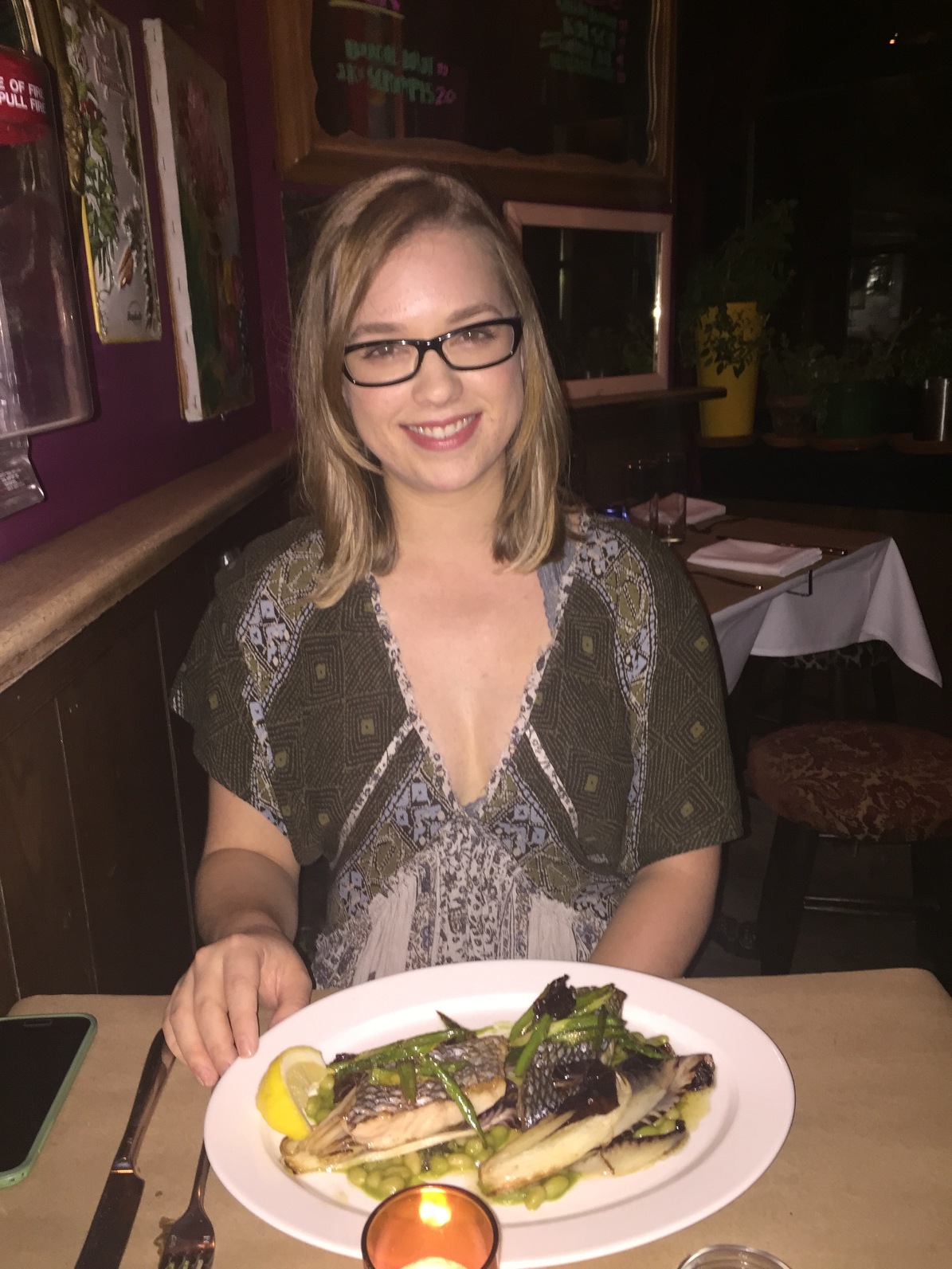 I passed the time deep in a long conversation with my cousin Emily. We forgot we were hungry until the food appeared in front of us. Just as I was about to tuck into my black bass, Emily needed to prove a point.